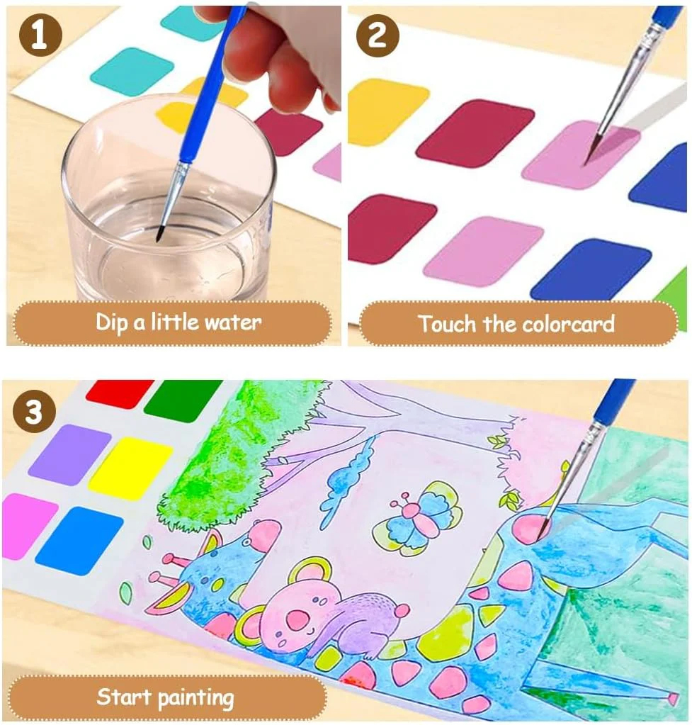 Watercolor coloring books for kids comes with brushes and paints, no need to buy brushes and paints. Just wet the brushes, moisten the paint palette, and fill in the pictures. The brushes are stored in the pad of the painting book, and the thoughtful design makes kids love this Water Paint Books